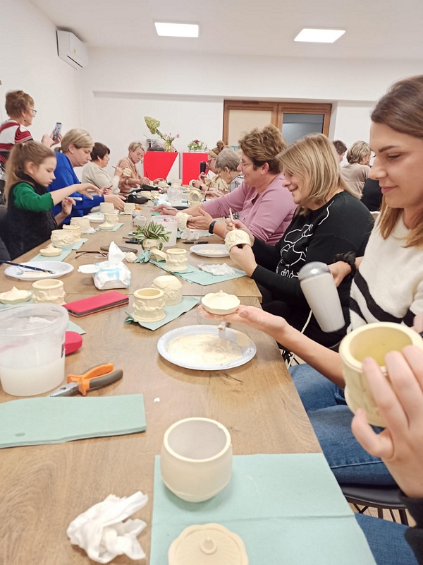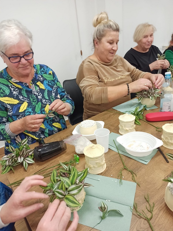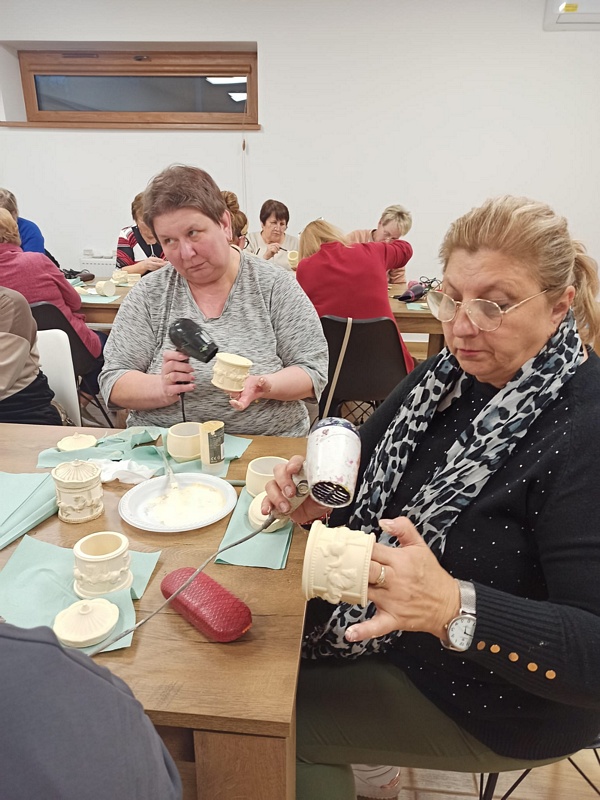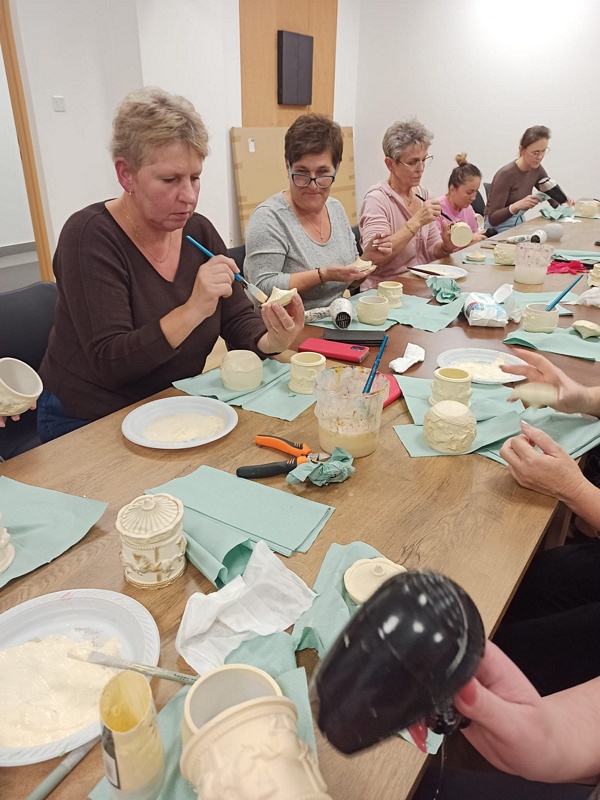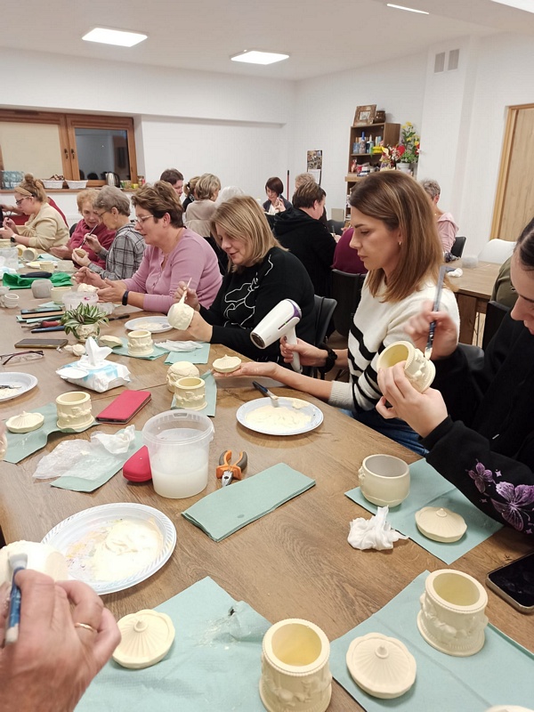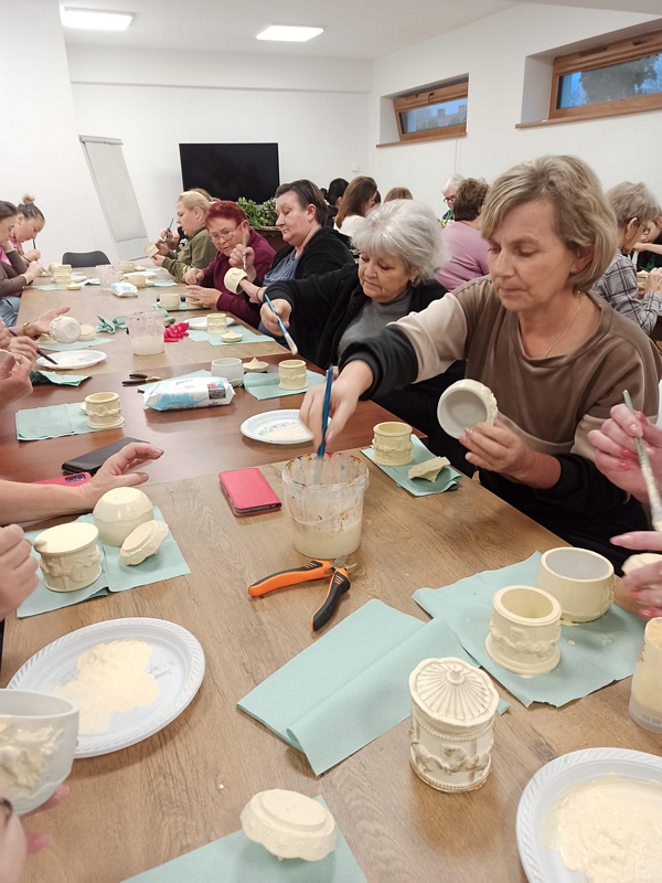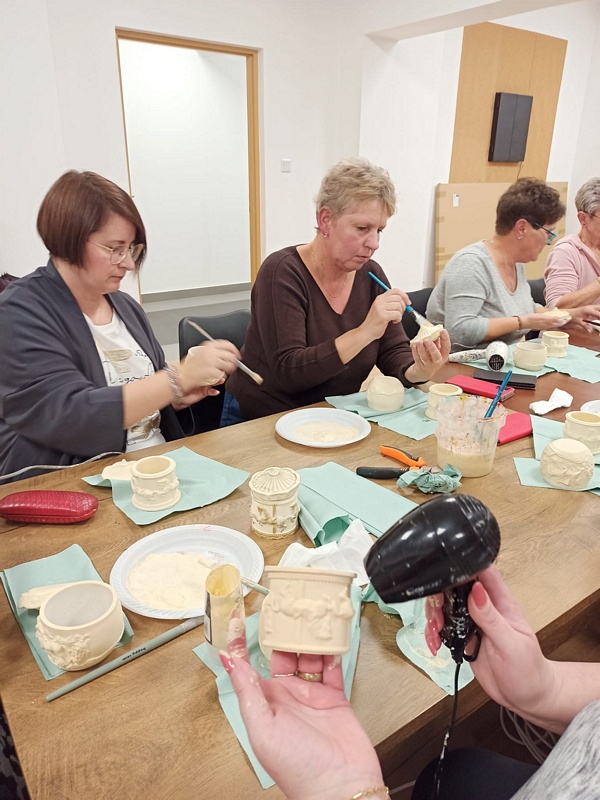Podczas warsztatów uczestniczki miały okazję poznać technikę tworzenia dekoracyjnych szkatułek i doniczek z białego cementu – materiału, który daje wiele możliwości artystycznego wyrazu. Praca z nim wymaga precyzji, cierpliwości i wyobraźni, ale jednocześnie przynosi wiele satysfakcji. W efekcie powstały piękne, unikatowe prace, które z pewnością będą ozdobą altanek, domów i ogrodów.