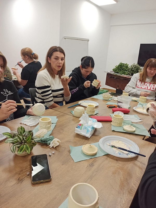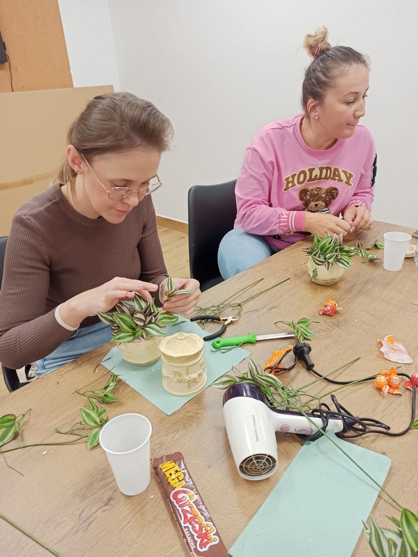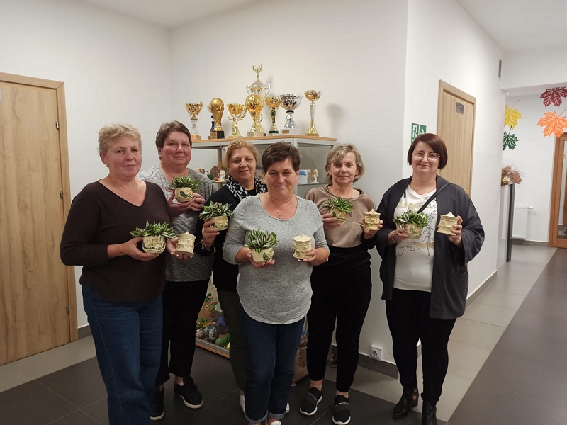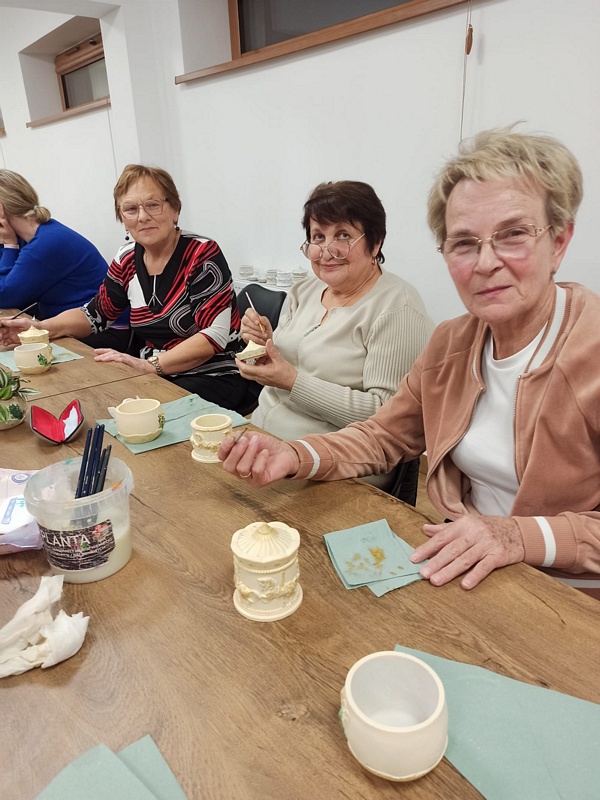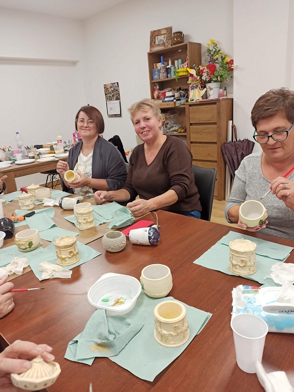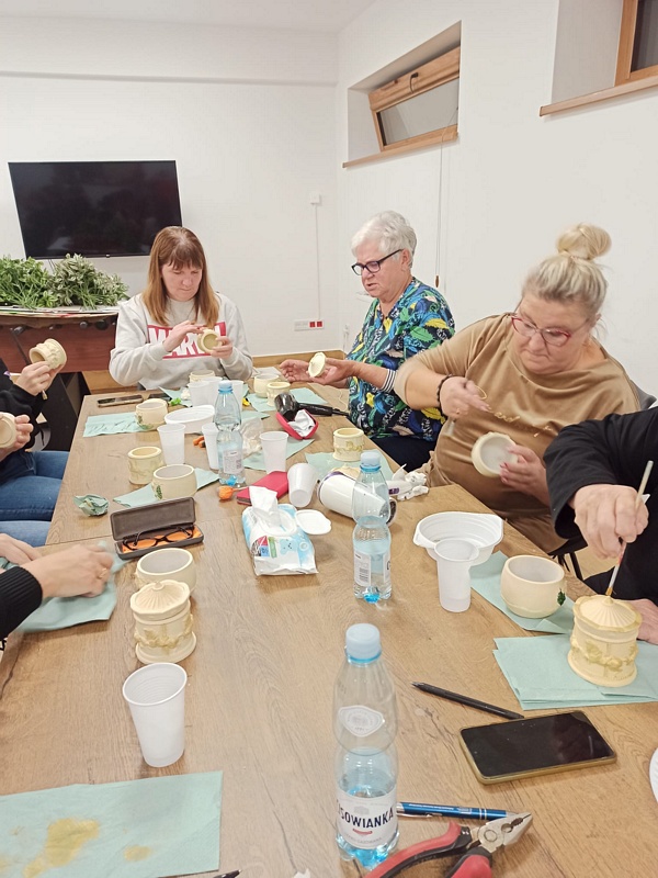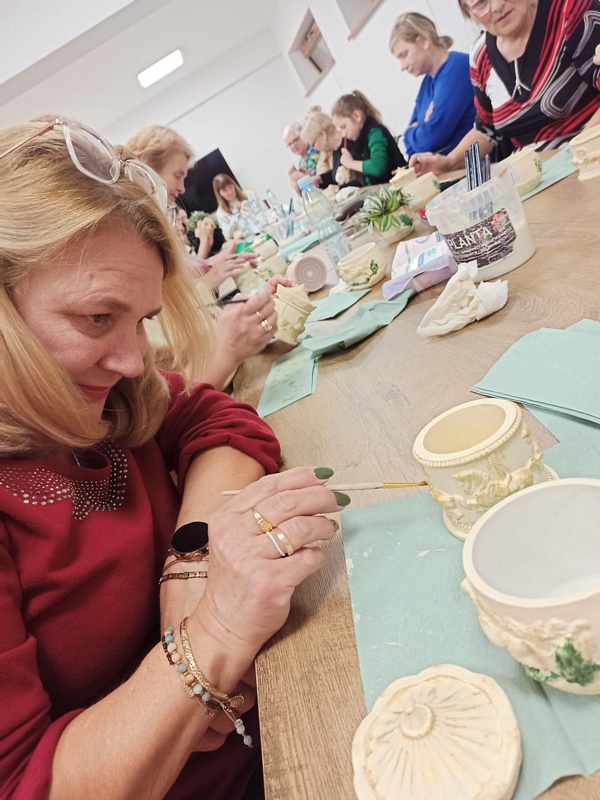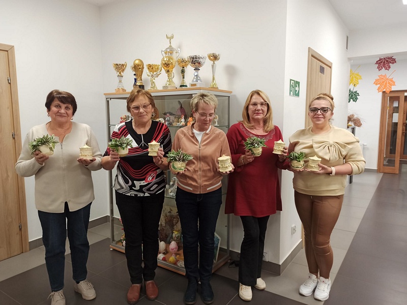 Podczas warsztatów uczestniczki miały okazję poznać technikę tworzenia dekoracyjnych szkatułek i doniczek z białego cementu – materiału, który daje wiele możliwości artystycznego wyrazu. Praca z nim wymaga precyzji, cierpliwości i wyobraźni, ale jednocześnie przynosi wiele satysfakcji. W efekcie powstały piękne, unikatowe prace, które z pewnością będą ozdobą altanek, domów i ogrodów.