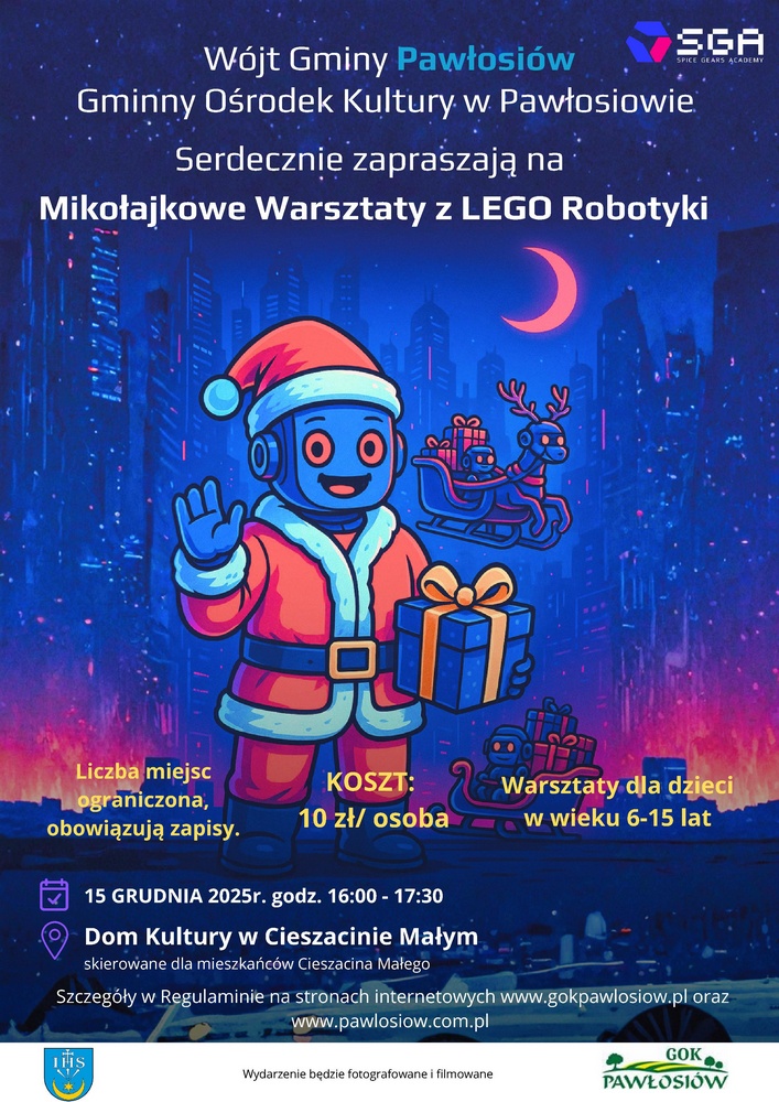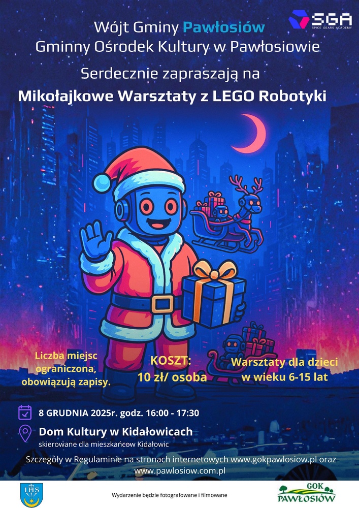 Z okazji zbliżających się Mikołajek Wójt Gminy Pawłosiów Mariusz Reń oraz Gminny Ośrodek Kultury w Pawłosiowie serdecznie zapraszają dzieci do udziału w Mikołajkowych Warsztatach z Lego Robotyki – wyjątkowych zajęciach, które łączą naukę, kreatywność i dobrą zabawę.