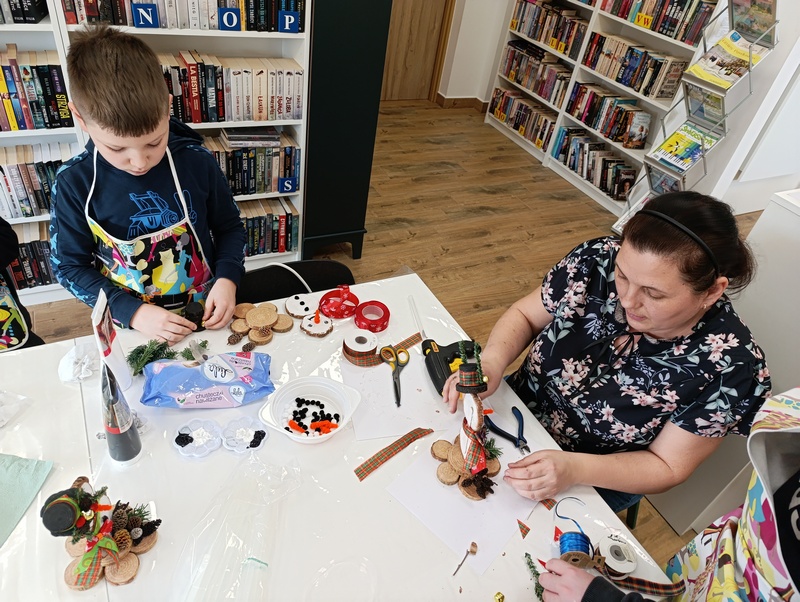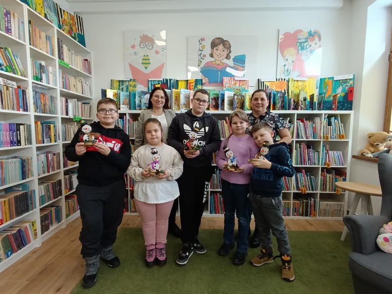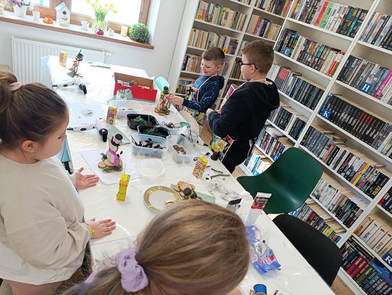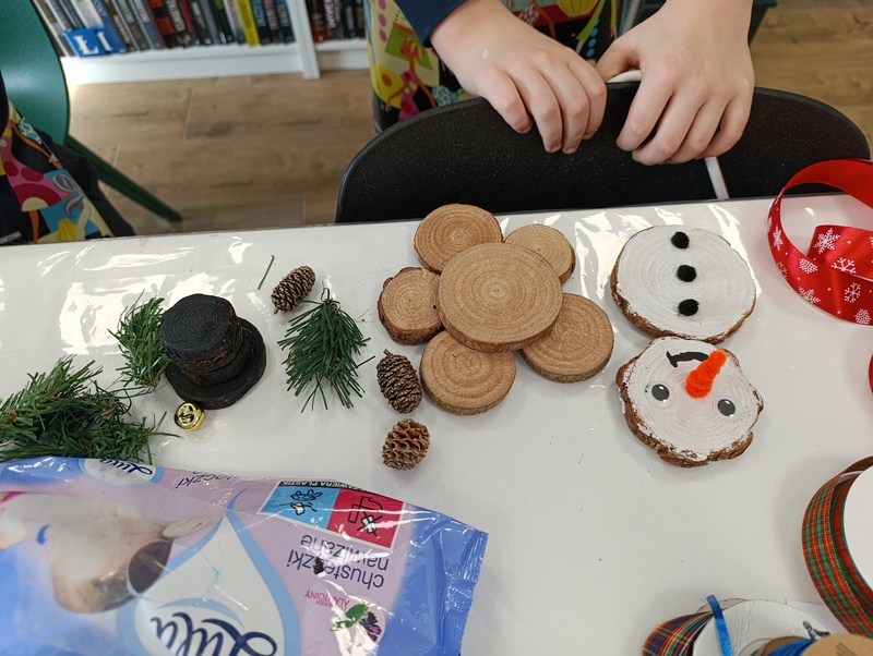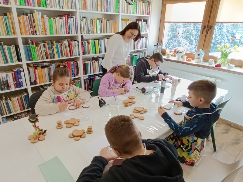 16 lutego 2026 r. w Gminnej Bibliotece Publicznej w Pawłosiowie odbyły się warsztaty techniczne z okazji ferii zimowych. Tematem warsztatów było tworzenie zimowych bałwanków z plastrów drewna. Uczestnicy korzystając z przygotowanych wcześniej drewnianych krążków, farb, wstążek i szyszek samodzielnie projektowali i ozdabiali swoje prace. Każdy bałwanek był piękny. Dzieci wykazały się dużą wyobraźnią, starannością oraz pomysłowością w doborze kolorów i dodatków. Podczas zajęć panowała ciepła i radosna atmosfera. Warsztaty były nie tylko okazją do rozwijania zdolności manualnych i kreatywności, ale również do integracji oraz wspólnej zabawy w czasie zimowego wypoczynku. Na zakończenie każde dziecko mogło zabrać swojego drewnianego bałwanka do domu jako pamiątkę z ferii spędzonych w bibliotece.