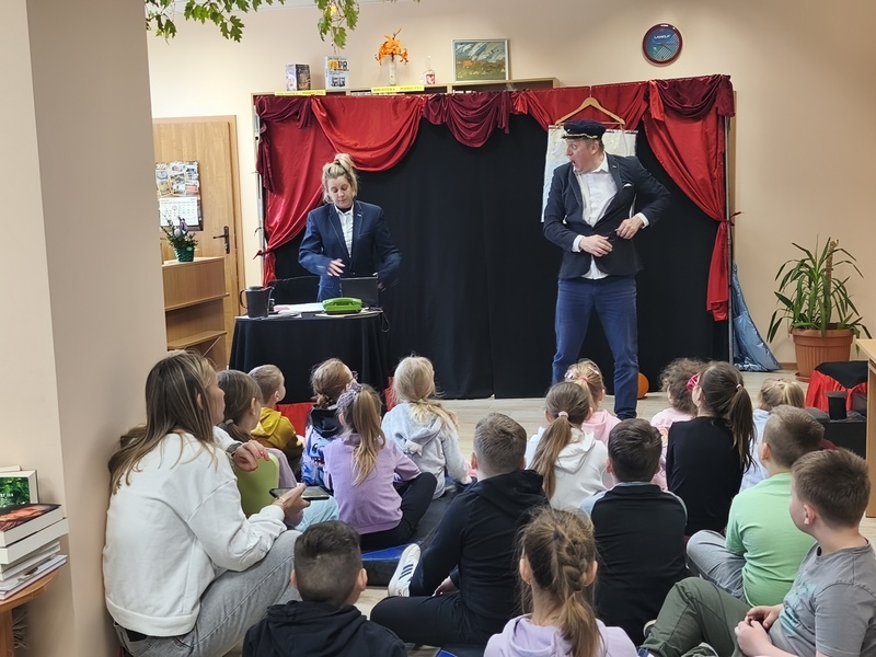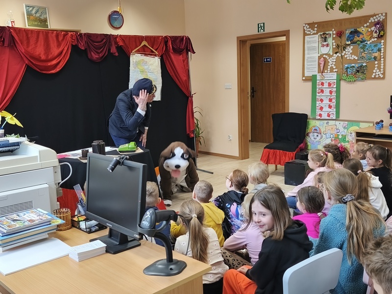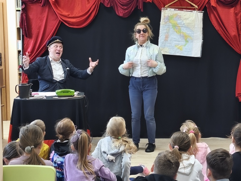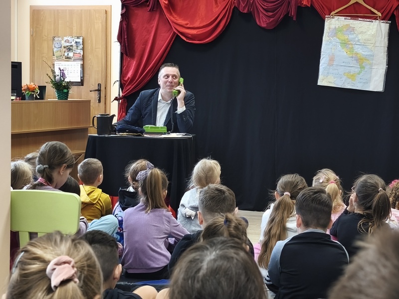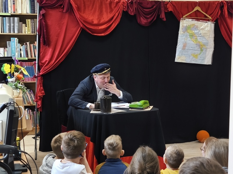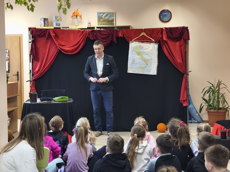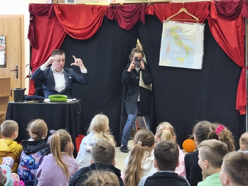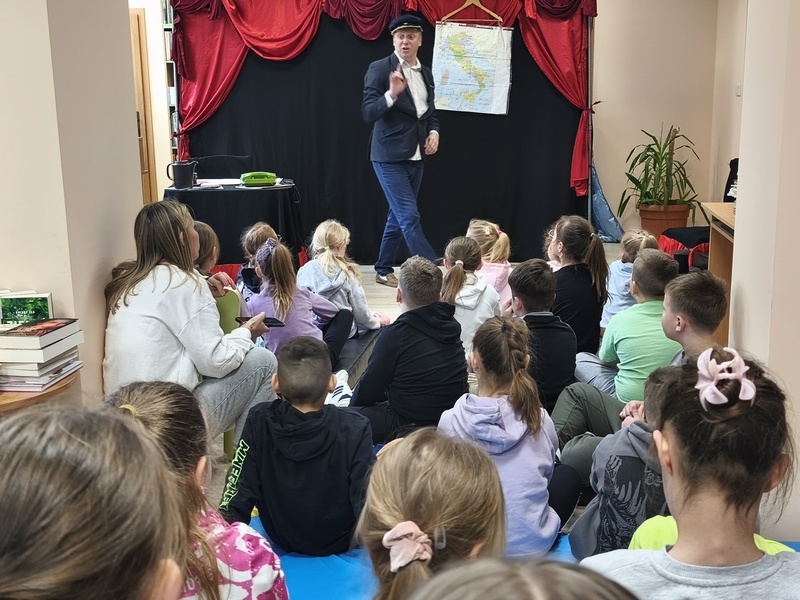 W Gminnej Bibliotece Publicznej Filii w Cieszacinie Wielkim 8 kwietnia 2026 r. gościliśmy Teatr Młodego Pokolenia z Wrocławia. Uczniowie klas I–III mieli okazję obejrzeć spektakl inspirowany lekturą autorstwa Romana Pisarskiego „O psie, który jeździł koleją”. Aktorzy w bardzo ciekawy sposób przybliżyli dzieciom przygody psa Lampo, które rozgrywały się we Włoszech. Widzowie z zaciekawieniem śledzili historię niezwykłej przyjaźni między człowiekiem a psem. Opowieść ta uświadomiła, jak wierne i oddane potrafią być zwierzęta oraz jak wiele dobra i radości mogą sprawić swoim opiekunom. Przedstawienie przypomniało również o tym jak ważna jest troska o zwierzęta. Nie da się ukryć, spektakl bardzo się podobał. Za występ podziękowały gromkimi brawami.