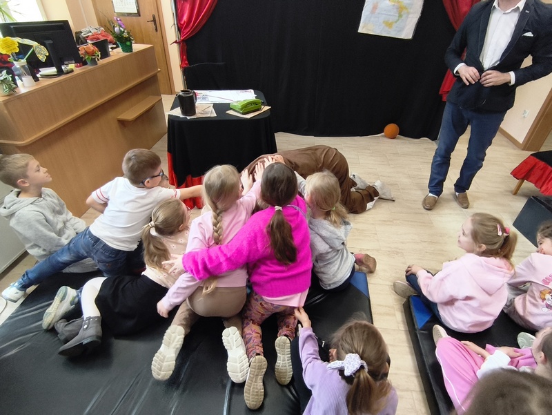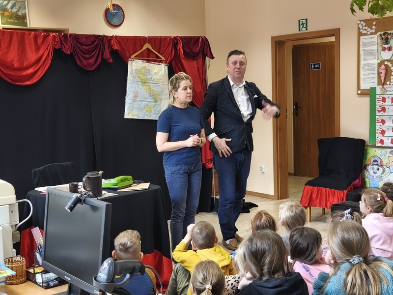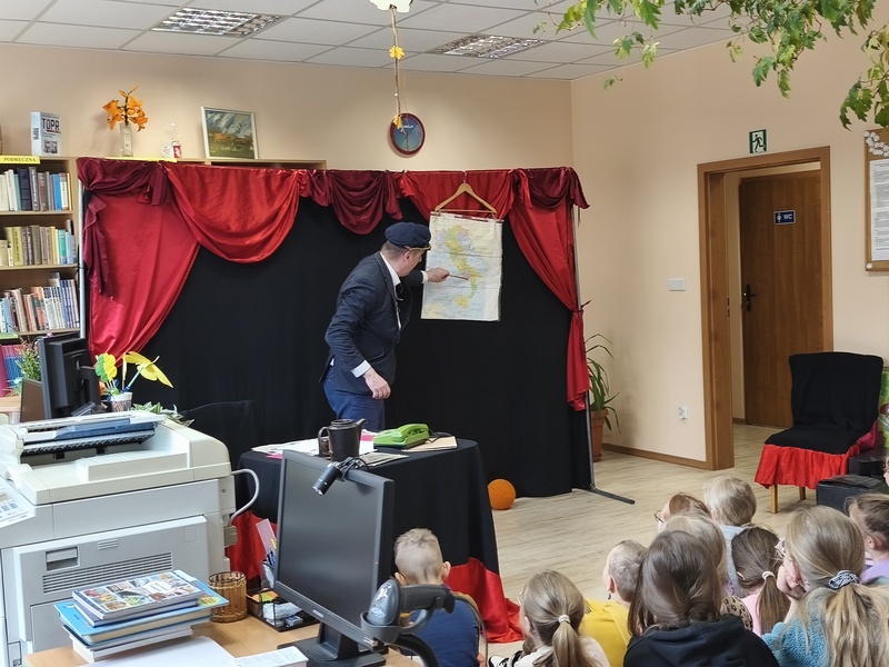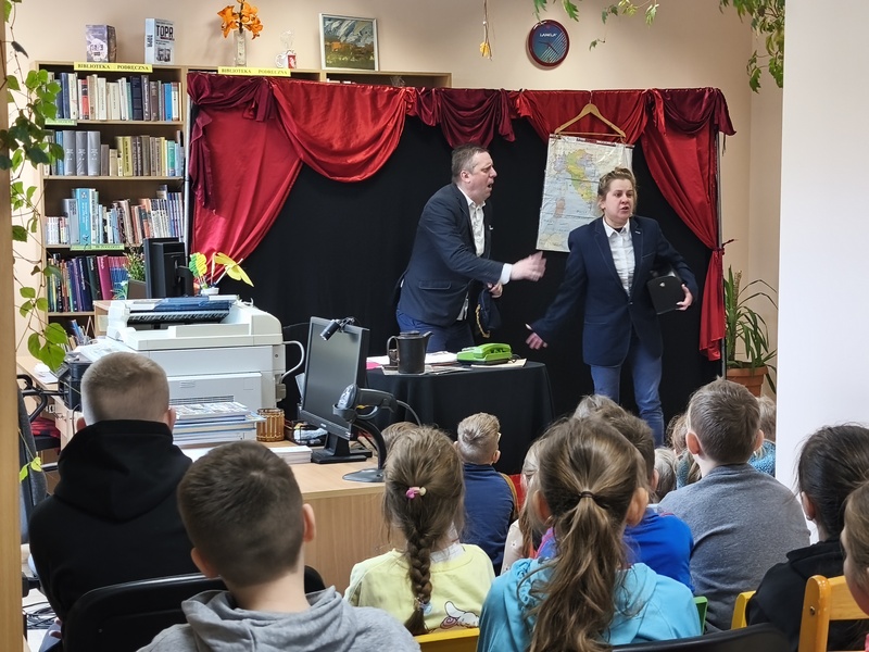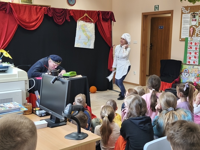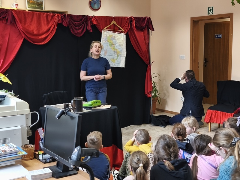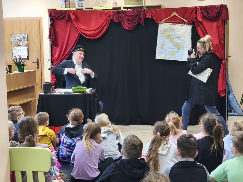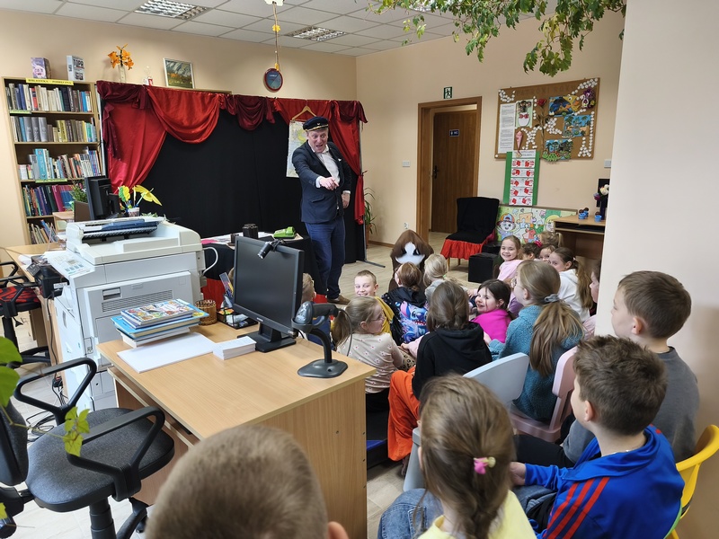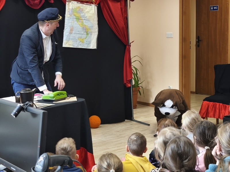 W Gminnej Bibliotece Publicznej Filii w Cieszacinie Wielkim 8 kwietnia 2026 r. gościliśmy Teatr Młodego Pokolenia z Wrocławia. Uczniowie klas I–III mieli okazję obejrzeć spektakl inspirowany lekturą autorstwa Romana Pisarskiego „O psie, który jeździł koleją”. Aktorzy w bardzo ciekawy sposób przybliżyli dzieciom przygody psa Lampo, które rozgrywały się we Włoszech. Widzowie z zaciekawieniem śledzili historię niezwykłej przyjaźni między człowiekiem a psem. Opowieść ta uświadomiła, jak wierne i oddane potrafią być zwierzęta oraz jak wiele dobra i radości mogą sprawić swoim opiekunom. Przedstawienie przypomniało również o tym jak ważna jest troska o zwierzęta. Nie da się ukryć, spektakl bardzo się podobał. Za występ podziękowały gromkimi brawami.