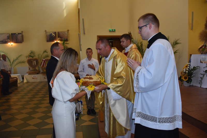 Następnie odbyło się uroczyste przekazanie przez starostów, Angelikę Maślanka i Mariusza Mac, Gospodarzowi dożynek Mariuszowi Reń poświęconego chleba, którym po rozkrojeniu obdzieleni zostali wszyscy uczestnicy wydarzenia.