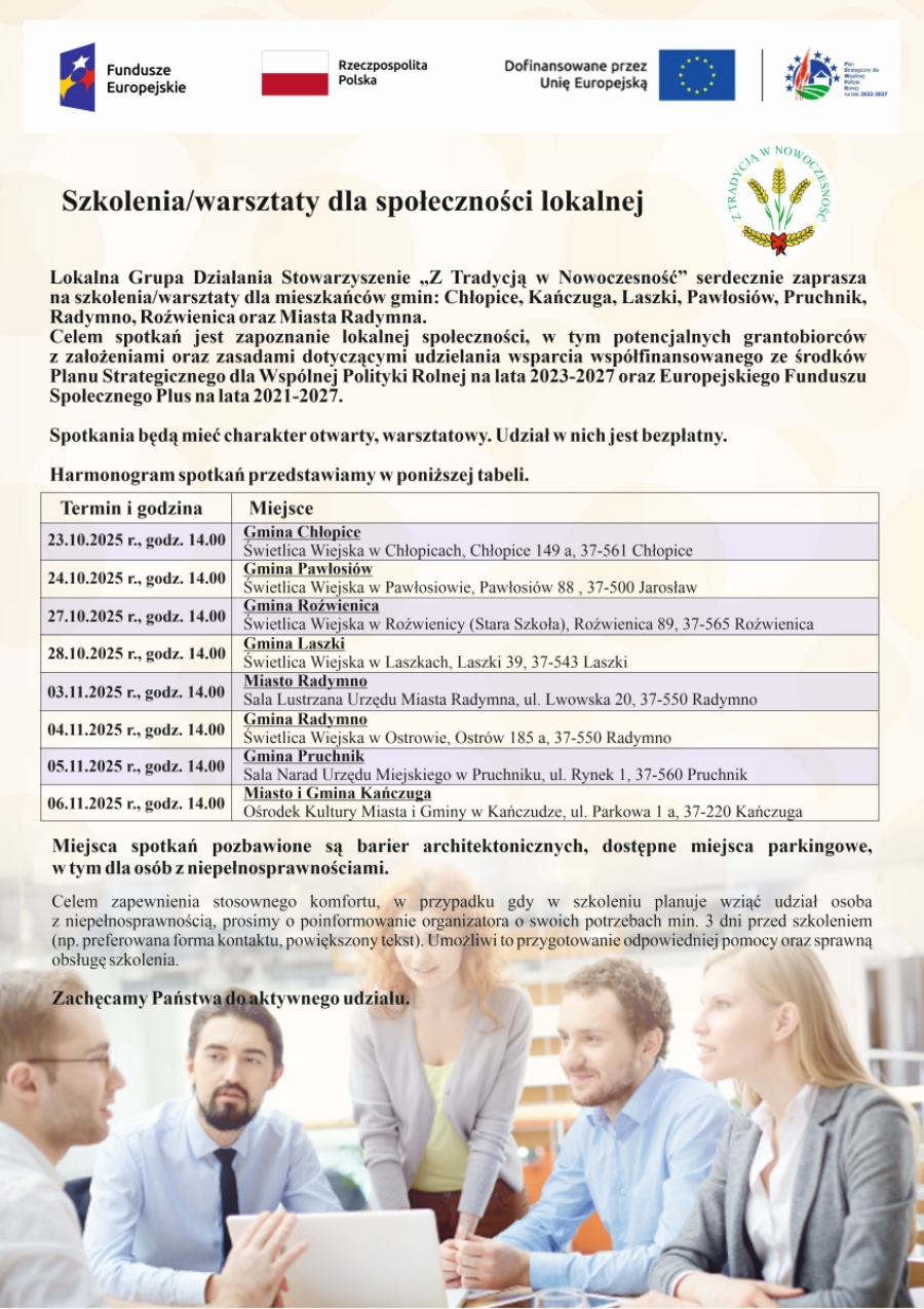 Lokalna Grupa Działania Stowarzyszenie „Z Tradycją w Nowoczesność” serdecznie zaprasza na tegoroczny cykl szkoleń/warsztatów dla społeczności lokalnej zamieszkującej gminy: Chłopice, Kańczuga, Laszki, Pawłosiów, Pruchnik, Radymno, Roźwienica oraz Miasto Radymno. Celem spotkań jest zapoznanie lokalnej społeczności, w tym potencjalnych grantobiorców z założeniami oraz zasadami dotyczącymi udzielania wsparcia współfinansowanego ze środków Planu Strategicznego dla Wspólnej Polityki Rolnej na lata 2023-2027 oraz Europejskiego Funduszu Społecznego Plus.