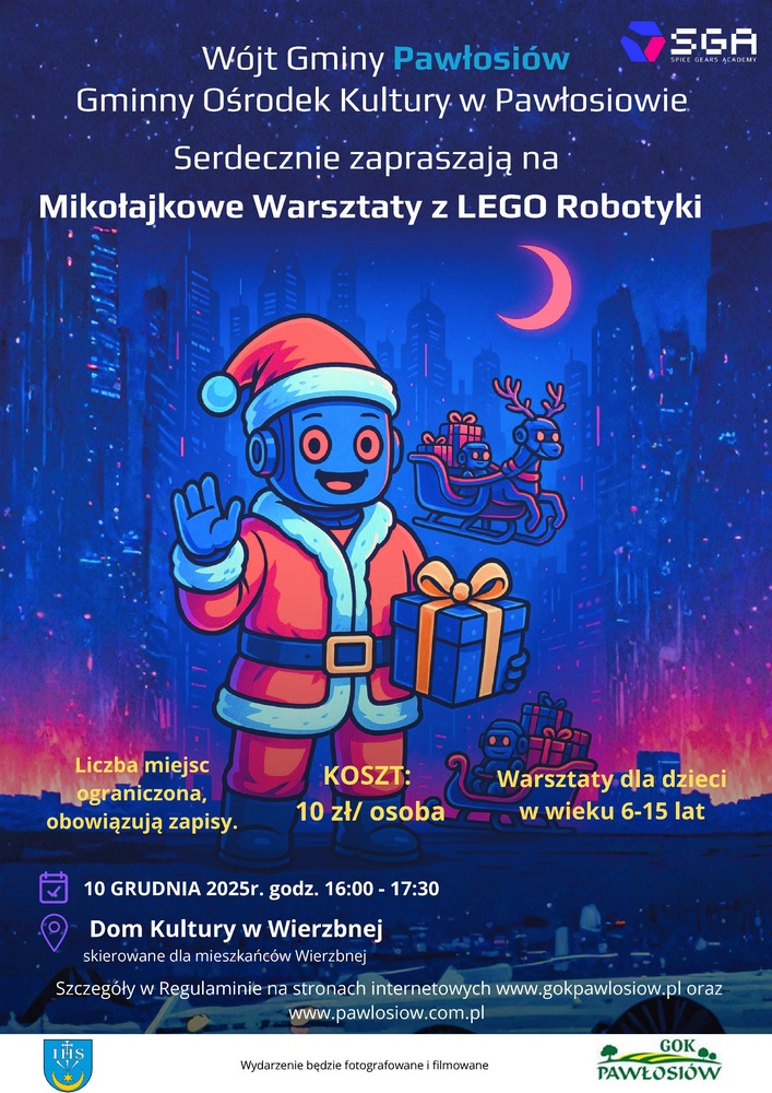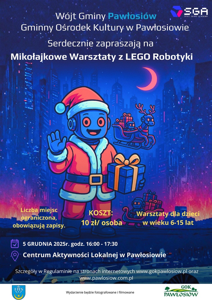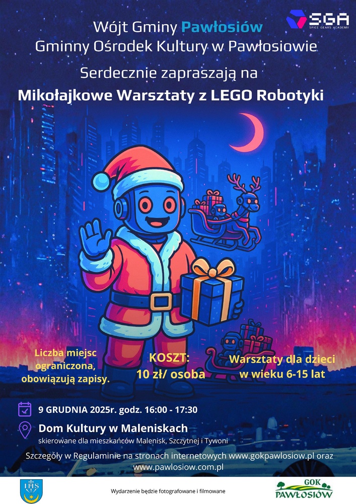 Z okazji zbliżających się Mikołajek Wójt Gminy Pawłosiów Mariusz Reń oraz Gminny Ośrodek Kultury w Pawłosiowie serdecznie zapraszają dzieci do udziału w Mikołajkowych Warsztatach z Lego Robotyki – wyjątkowych zajęciach, które łączą naukę, kreatywność i dobrą zabawę.