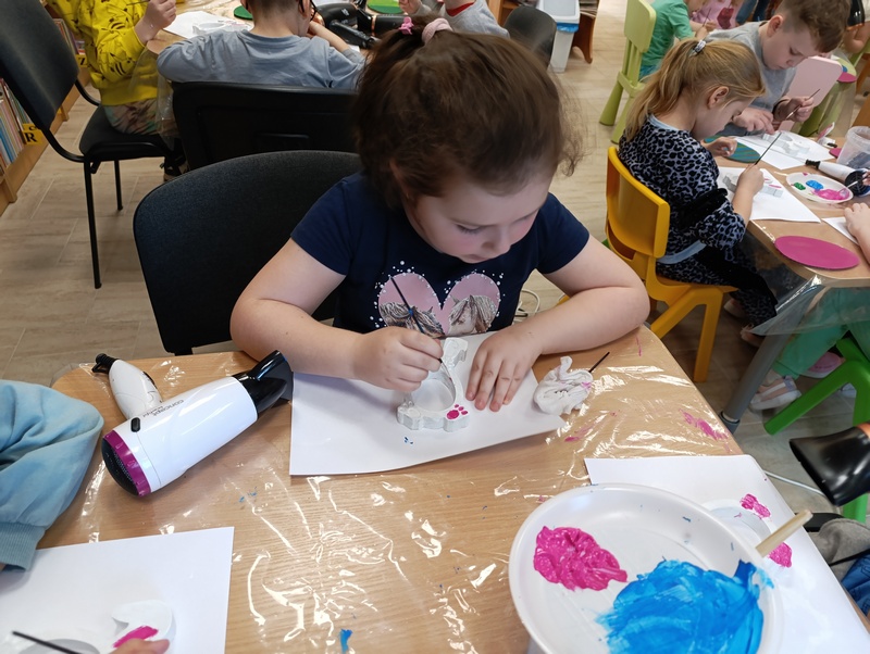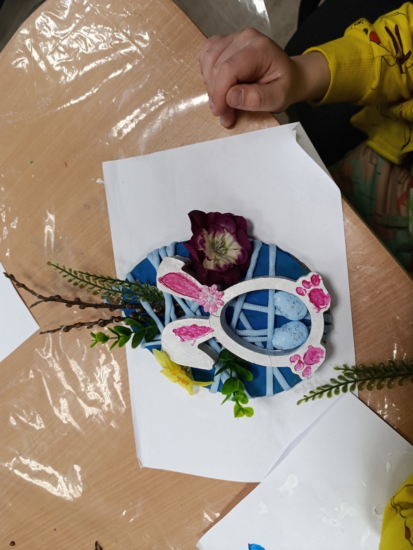 Korzystając z tekturki, kolorowych farb akrylowych, nici, zielonych roślinek oraz barwnych kwiatów, dzieci stworzyły piękne, ręcznie zdobione jajka wielkanocne. Każda praca odzwierciedlała pomysłowość oraz zaangażowanie młodych artystów.
