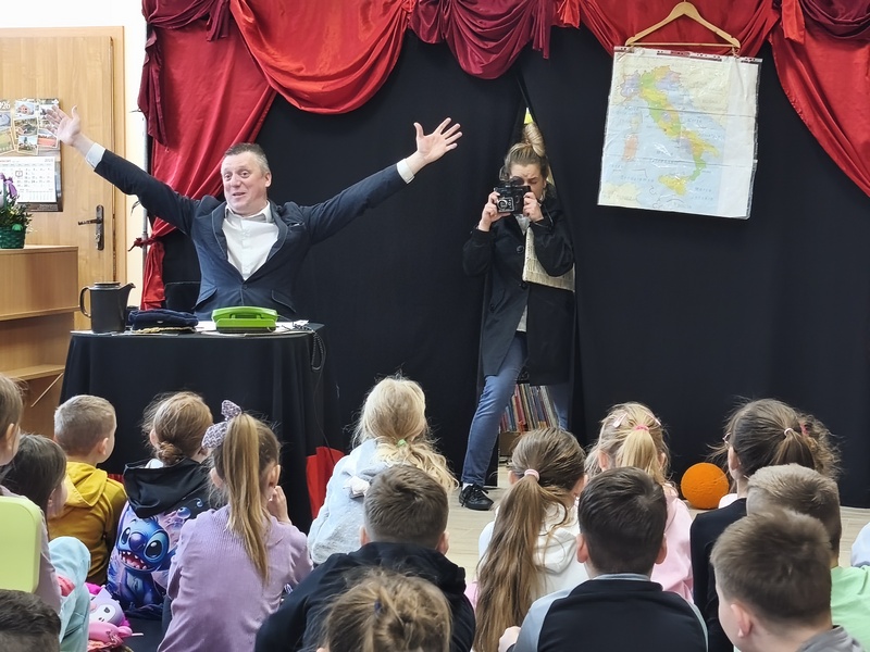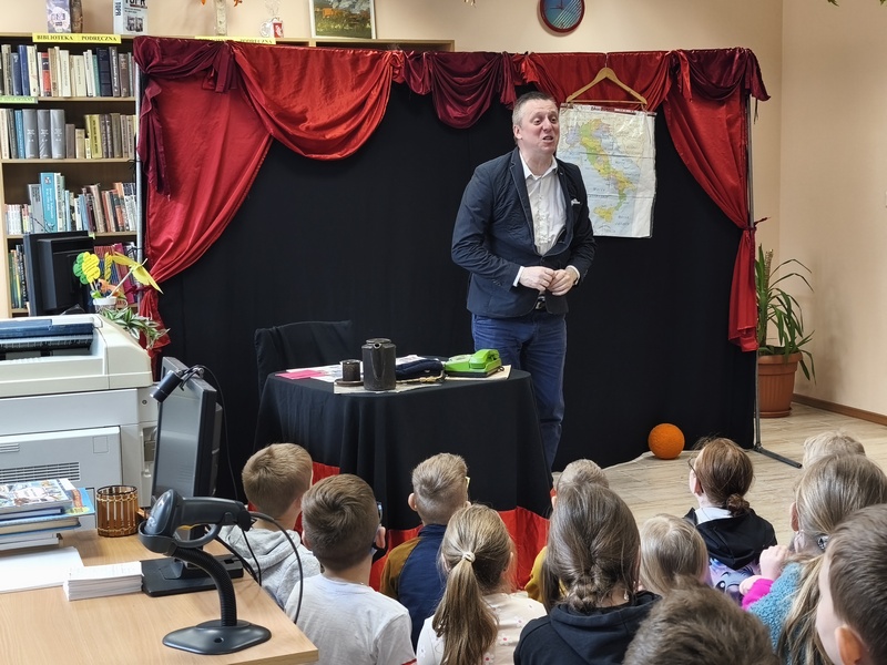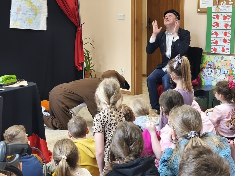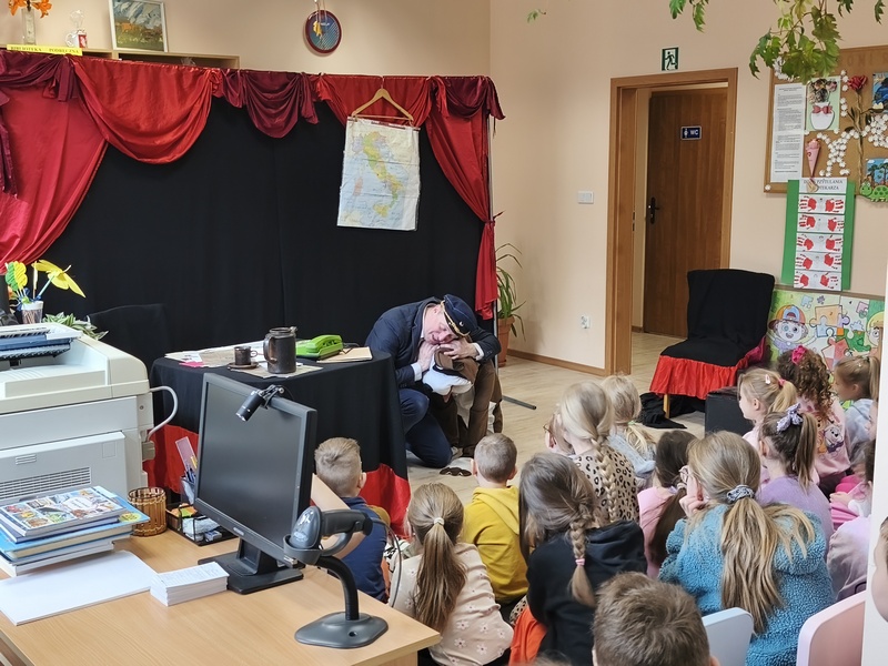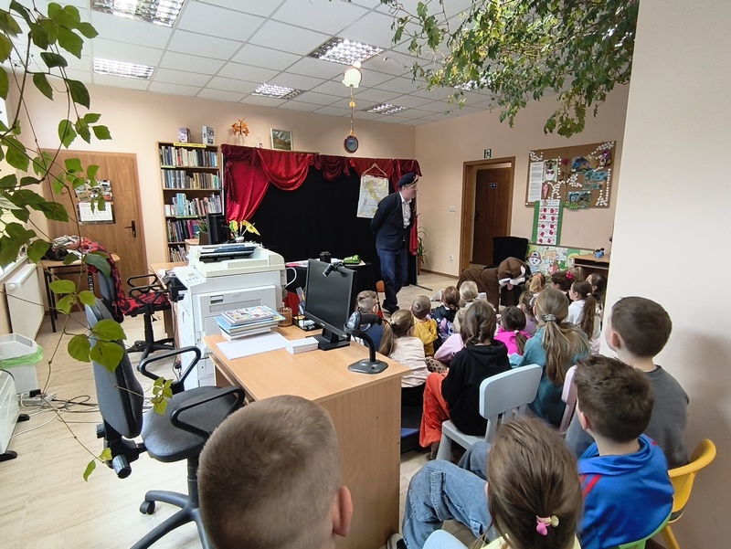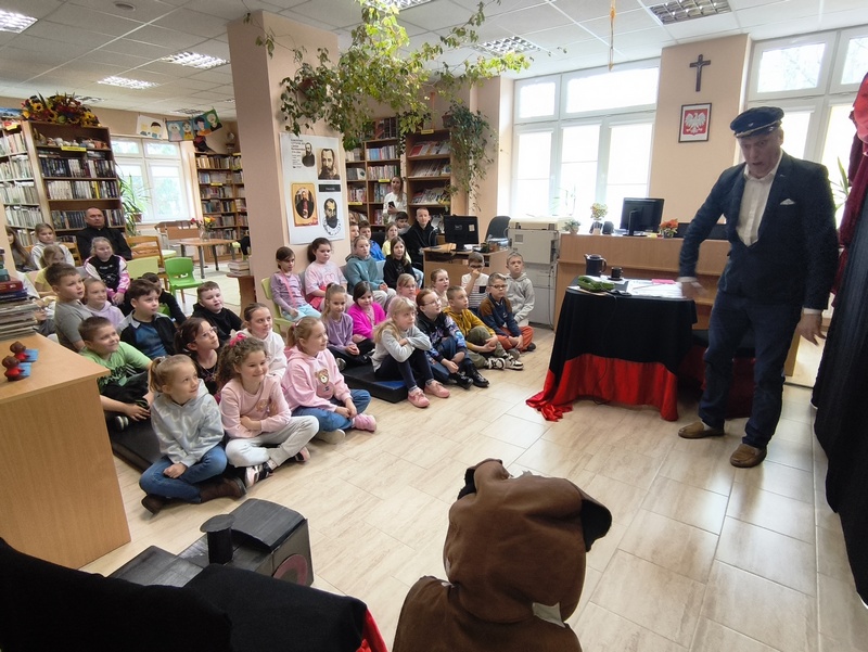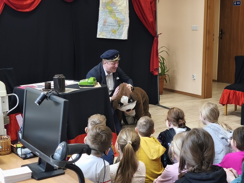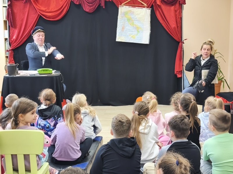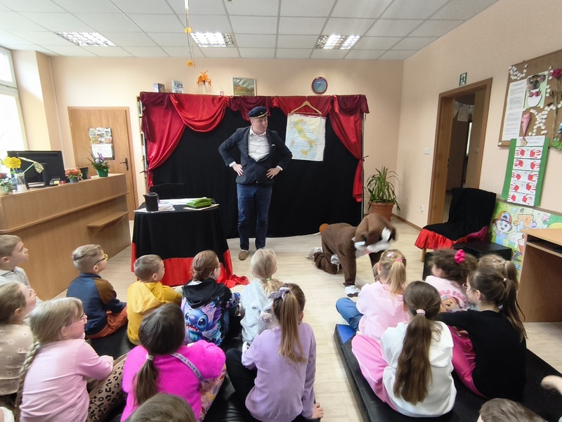 W Gminnej Bibliotece Publicznej Filii w Cieszacinie Wielkim 8 kwietnia 2026 r. gościliśmy Teatr Młodego Pokolenia z Wrocławia. Uczniowie klas I–III mieli okazję obejrzeć spektakl inspirowany lekturą autorstwa Romana Pisarskiego „O psie, który jeździł koleją”. Aktorzy w bardzo ciekawy sposób przybliżyli dzieciom przygody psa Lampo, które rozgrywały się we Włoszech. Widzowie z zaciekawieniem śledzili historię niezwykłej przyjaźni między człowiekiem a psem. Opowieść ta uświadomiła, jak wierne i oddane potrafią być zwierzęta oraz jak wiele dobra i radości mogą sprawić swoim opiekunom. Przedstawienie przypomniało również o tym jak ważna jest troska o zwierzęta. Nie da się ukryć, spektakl bardzo się podobał. Za występ podziękowały gromkimi brawami.