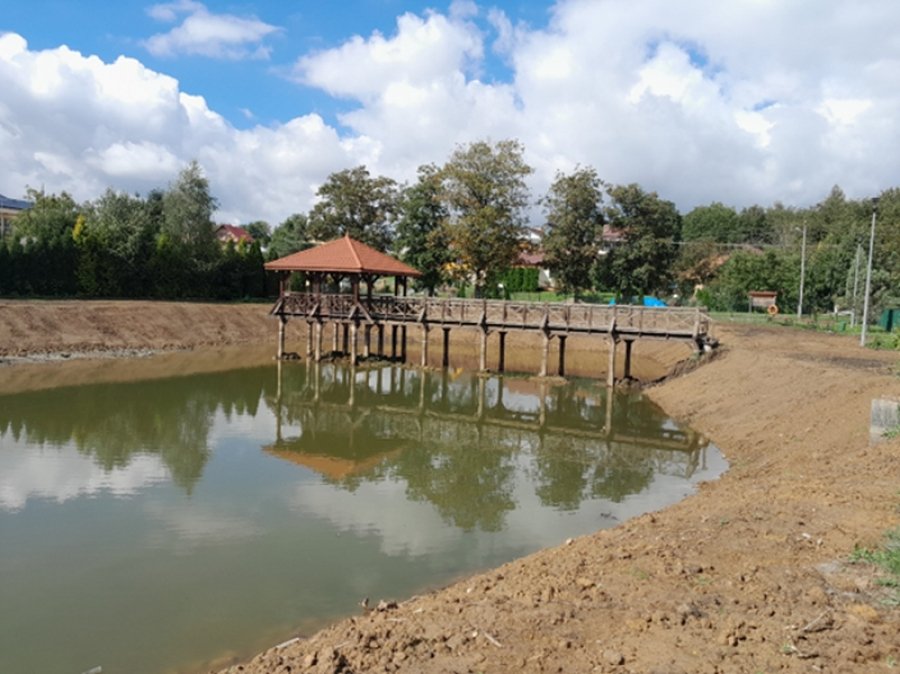 Zakres: Odmulenie dna stawu wraz ze wzmocnieniem skarp.