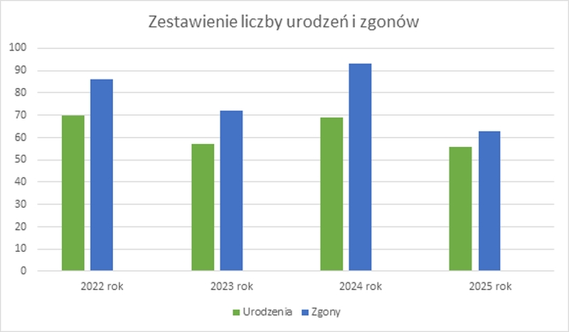 W 2025 r. urodziło się 56 dzieci, w tym 24 dziewczynki i 32 chłopców. Zmarło 63 osoby, w tym 30 kobiet i 33 mężczyzn.